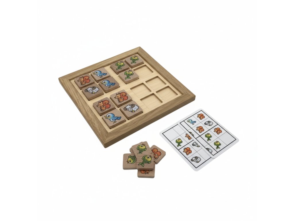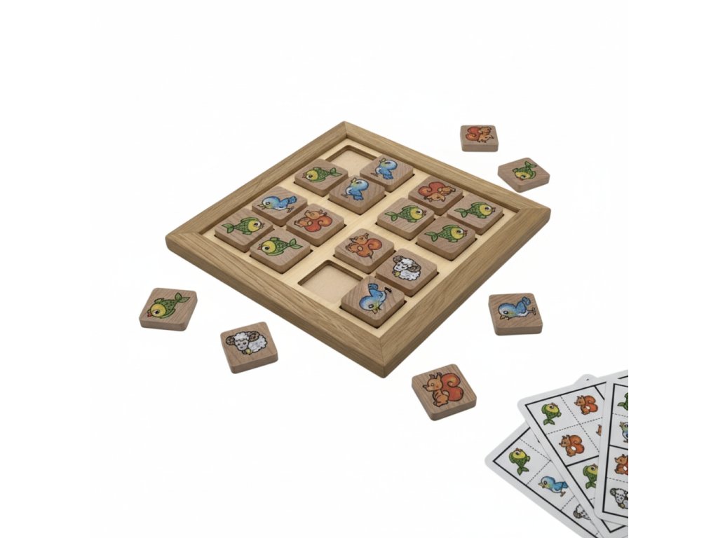 Okrem hracej dosky a kameňov je súčasťou balenia aj sada kariet. Na tých sú vytlačené 4 rôzne náročné úrovne hry. Na jednej strane kariet nájdete zadanie hry a na druhej potom jej správne riešenie.Toto všetko tvorí hru Zvieratkové Sudoku 4×4.